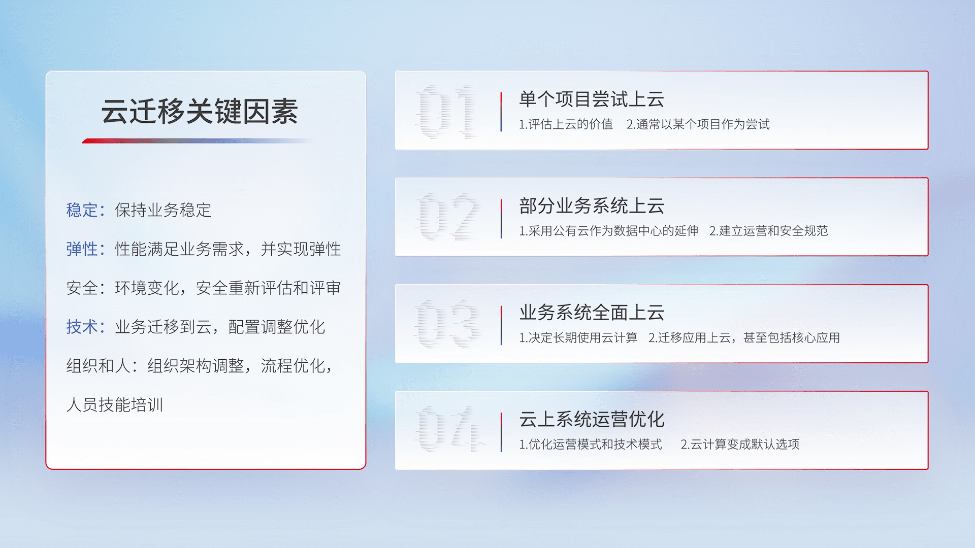 结合实际业务,,,,从规划设计、、、云平台选型、、、、云原生改造、、、数据迁移、、、集成交付,,迁移全过程为客户识别最佳上云路径,,做好风险识别管理,,,,设计网络架构、、身份权限、、、安全审计合规、、、操作审计、、、、日志审计、、、监控告警策略、、、多站点容灾设计等,,对云上基础设施进行整体规划,,,提升IT治理水平,,以满足弹性、、、、高可用、、、高性能的需求。。。。