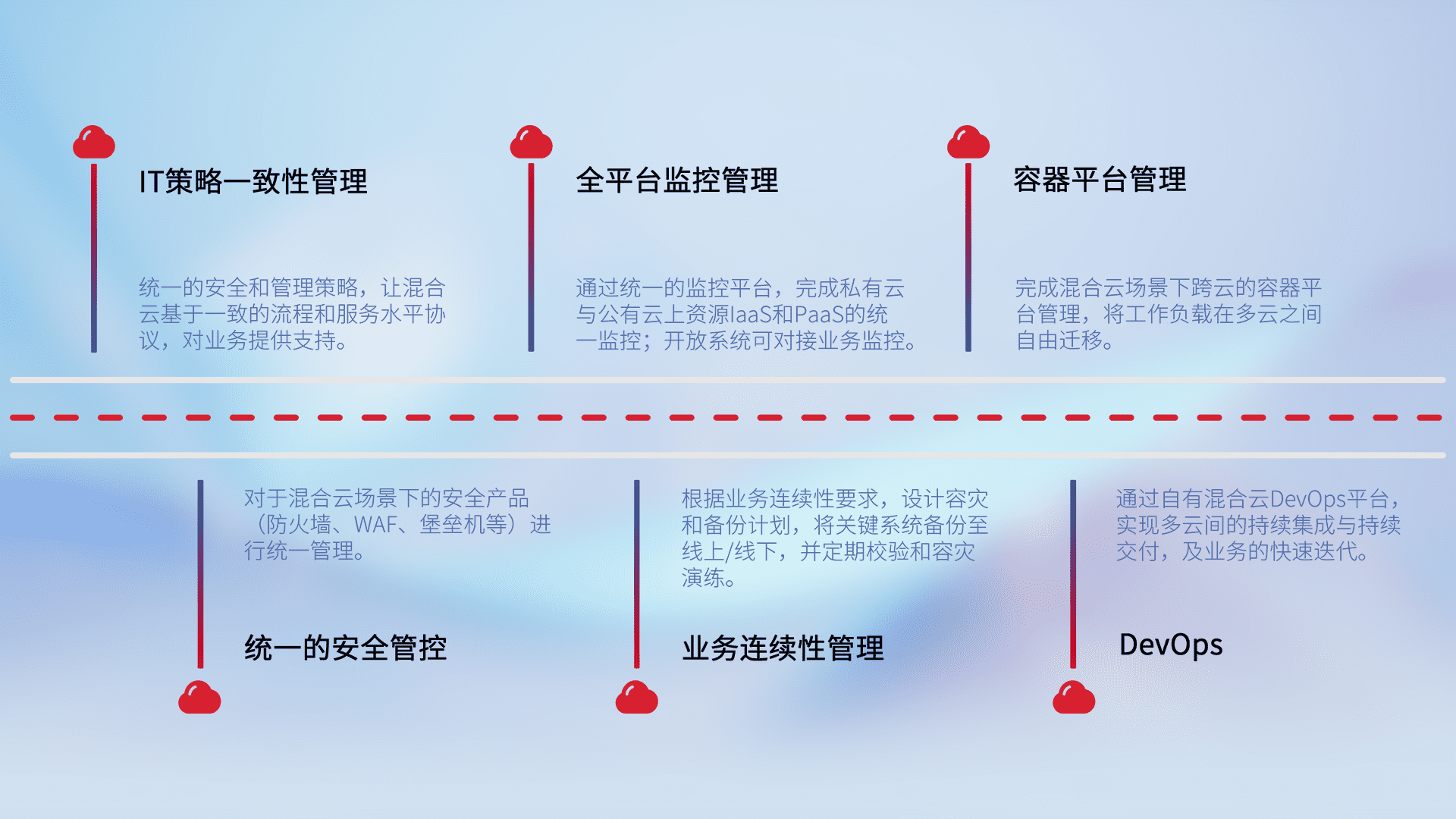 通过多云纳管,,以统一的资源数据模型把客户的云资源进行抽象和封装,,,进而实现对多云资源的统一操作,,,保障云资源管理的可靠性、、稳定性与可用性。。。量身定制化运维内容,,,配置、、开发运维、、、、补丁管理、、、备份、、监控、、认证和访问管理、、、、审计和日常巡检等,,保障在用云过程中的可靠度,,稳定度以及高可用率。。
