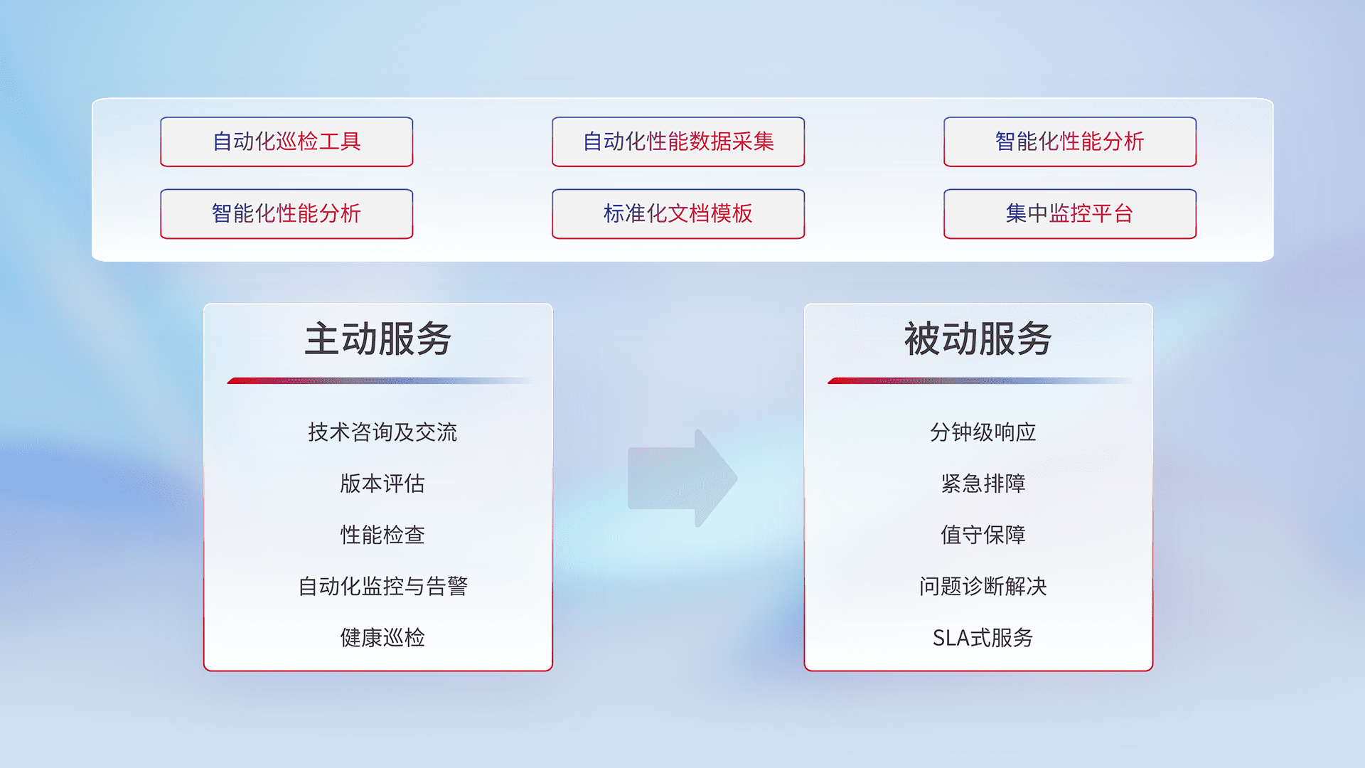 智能化工具和标准化文档,,,保障服务质量,,,,提供主动服务(包含技术咨询、、、、版本评估、、、、性能检查、、、、自动化监控与告警、、健康巡检)和被动服务包含(分钟级响应、、紧急排障、、值守保障、、问题诊断解决、、SLA服务)。。。。
