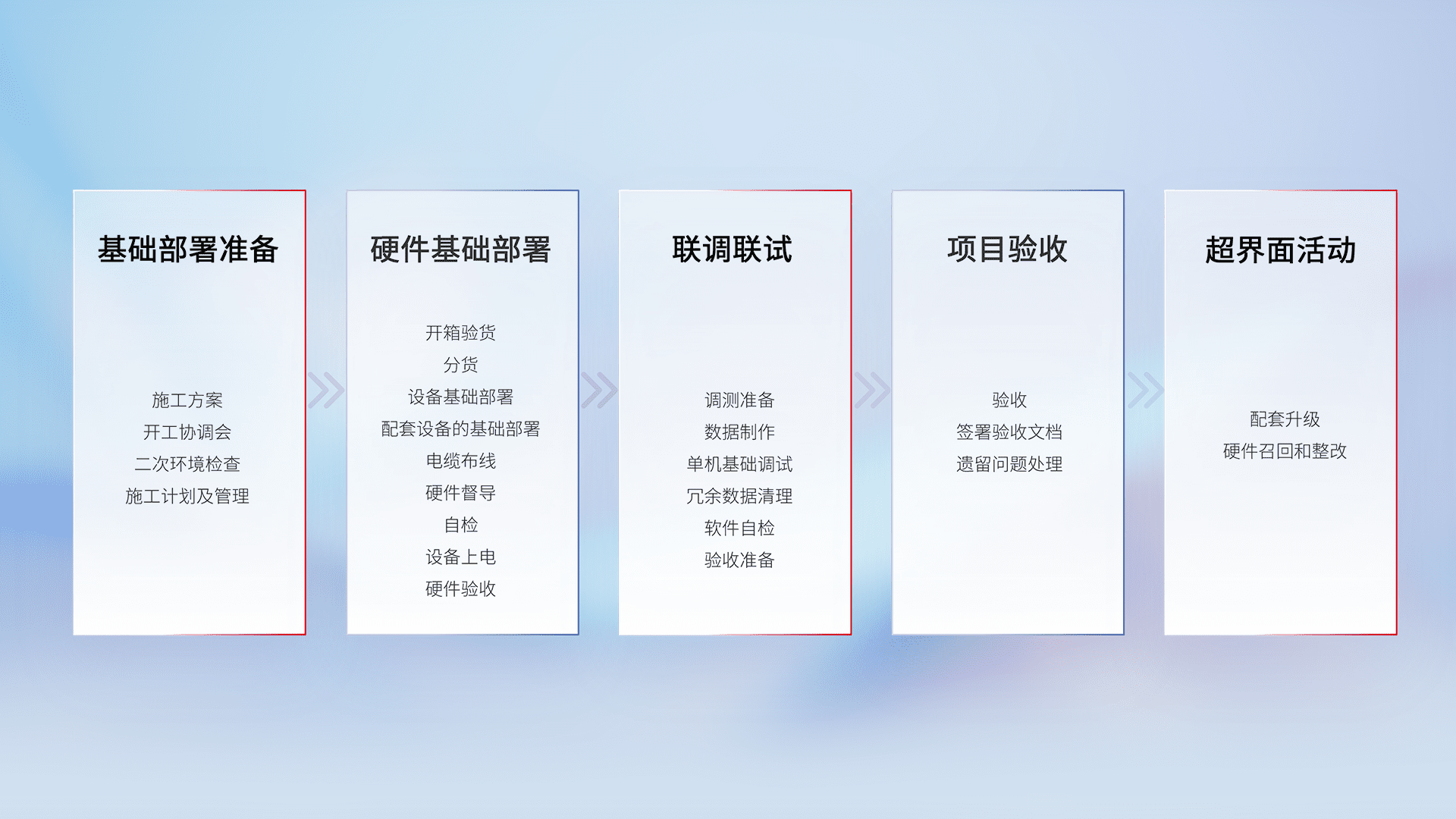 从基础部署准备、、硬件基础部署、、、联调联试、、项目验收、、、、越界面活动的全过程可追溯,,保证施工质量和进度。。。。